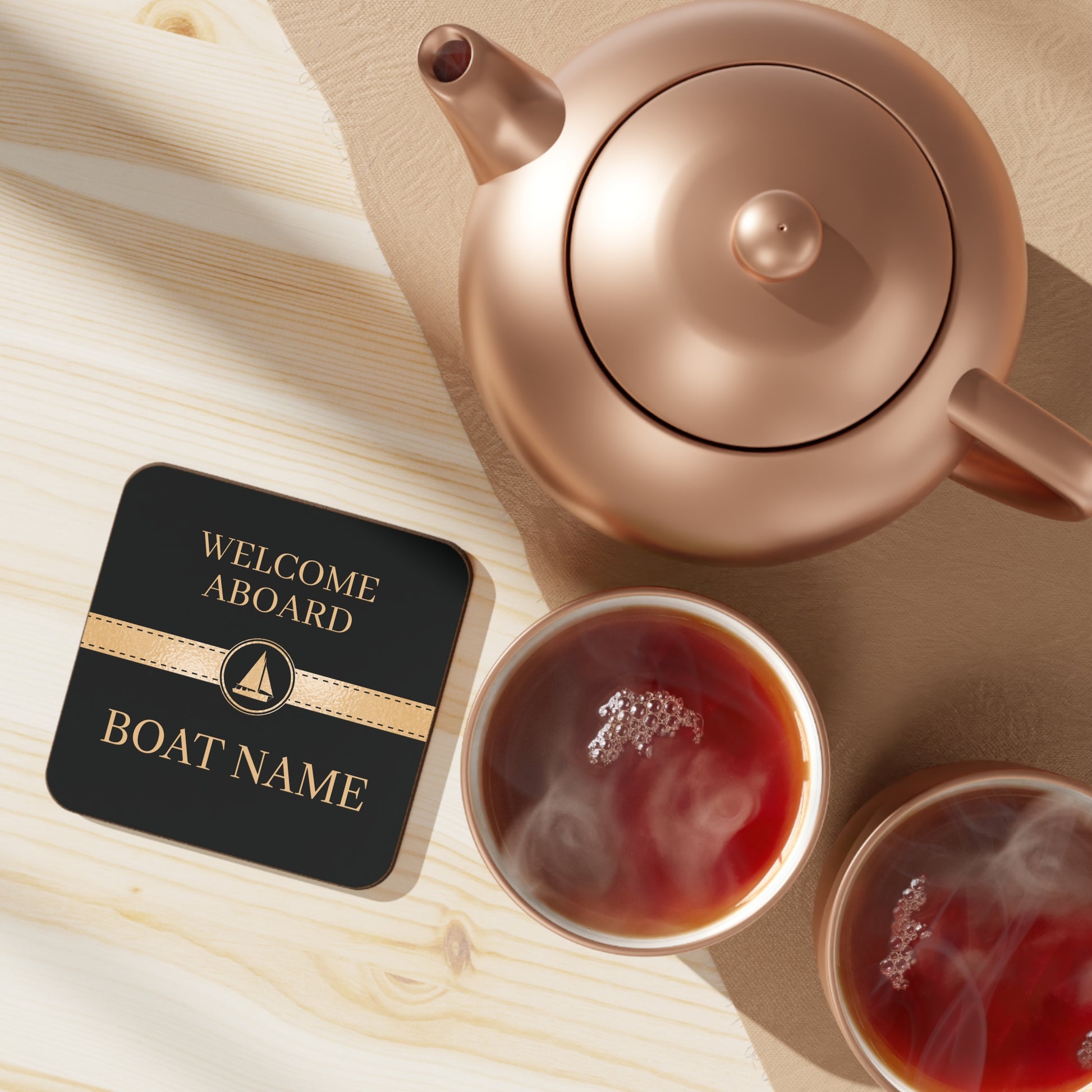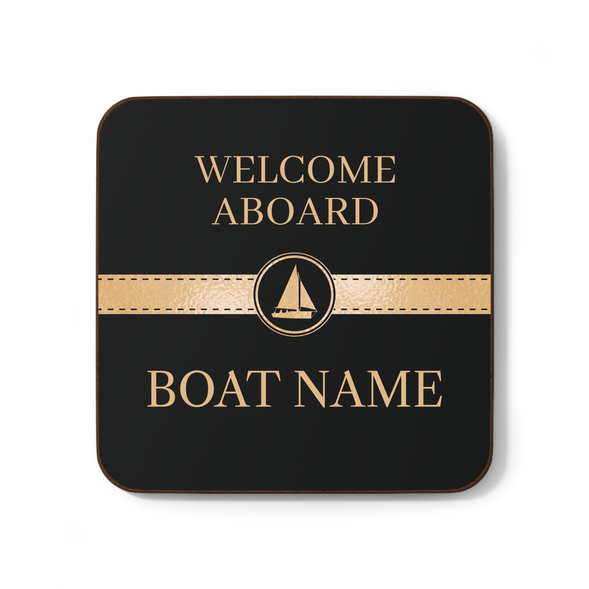 This is a set of 4 high quality nautical coasters personalized with your boat name. It features a black and gold sailboat design.