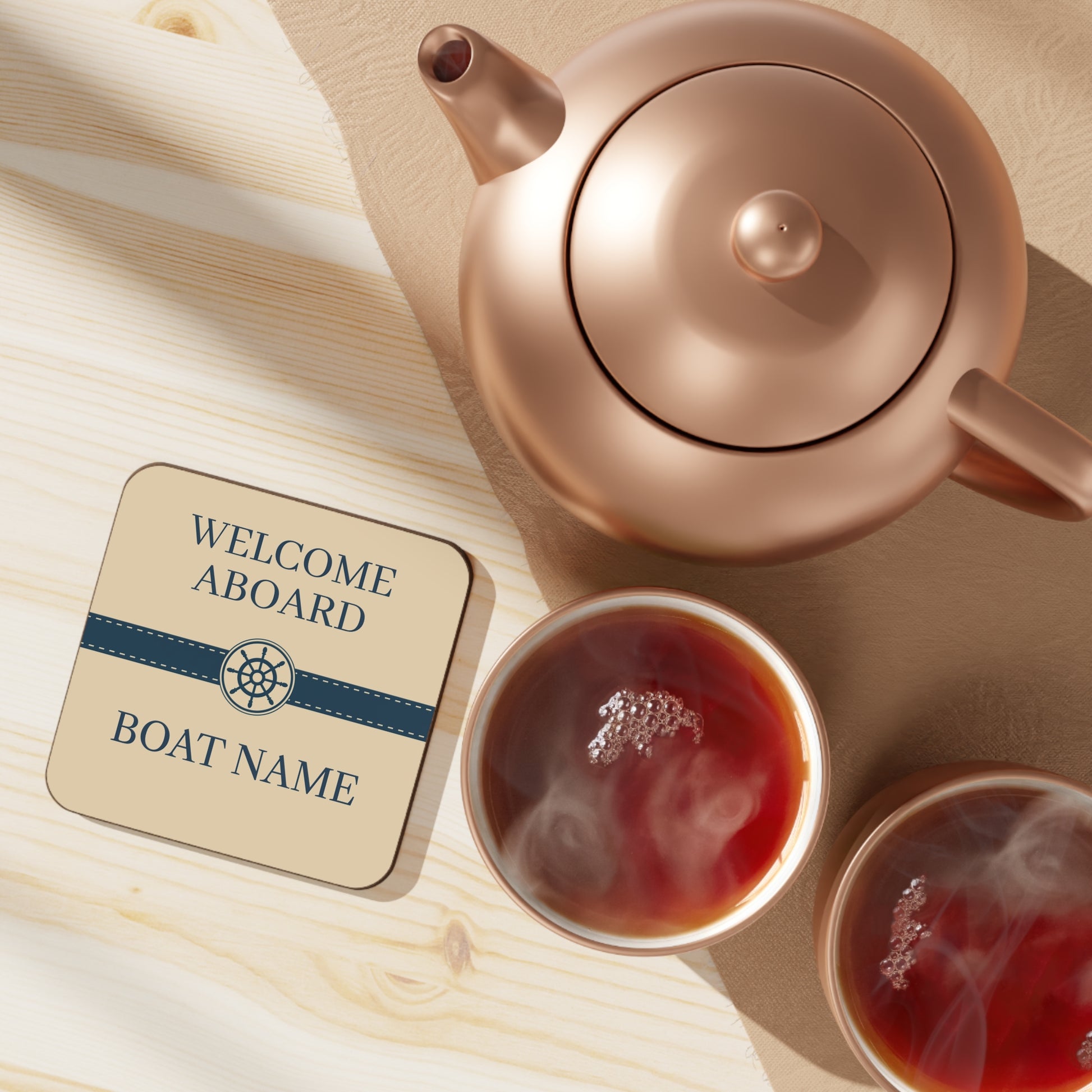 This is a set of 4 high quality nautical coasters personalized with your boat name. It features a beige and blue ship wheel design.