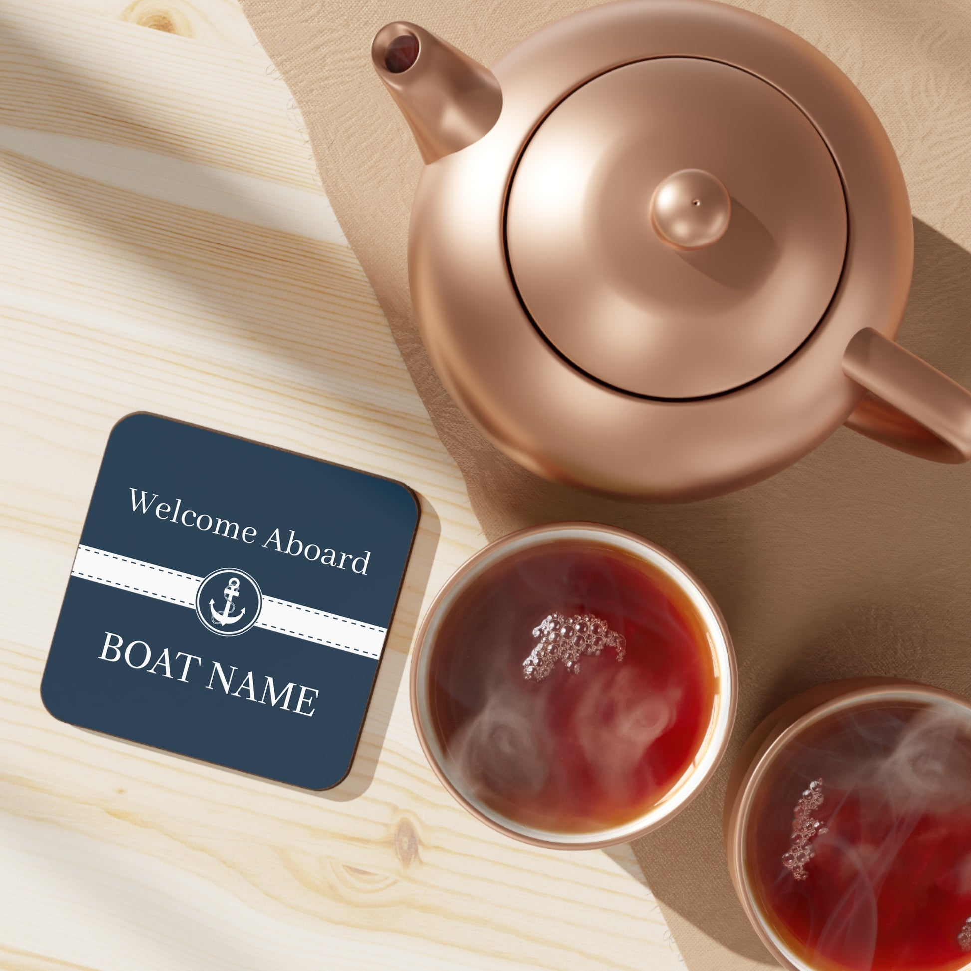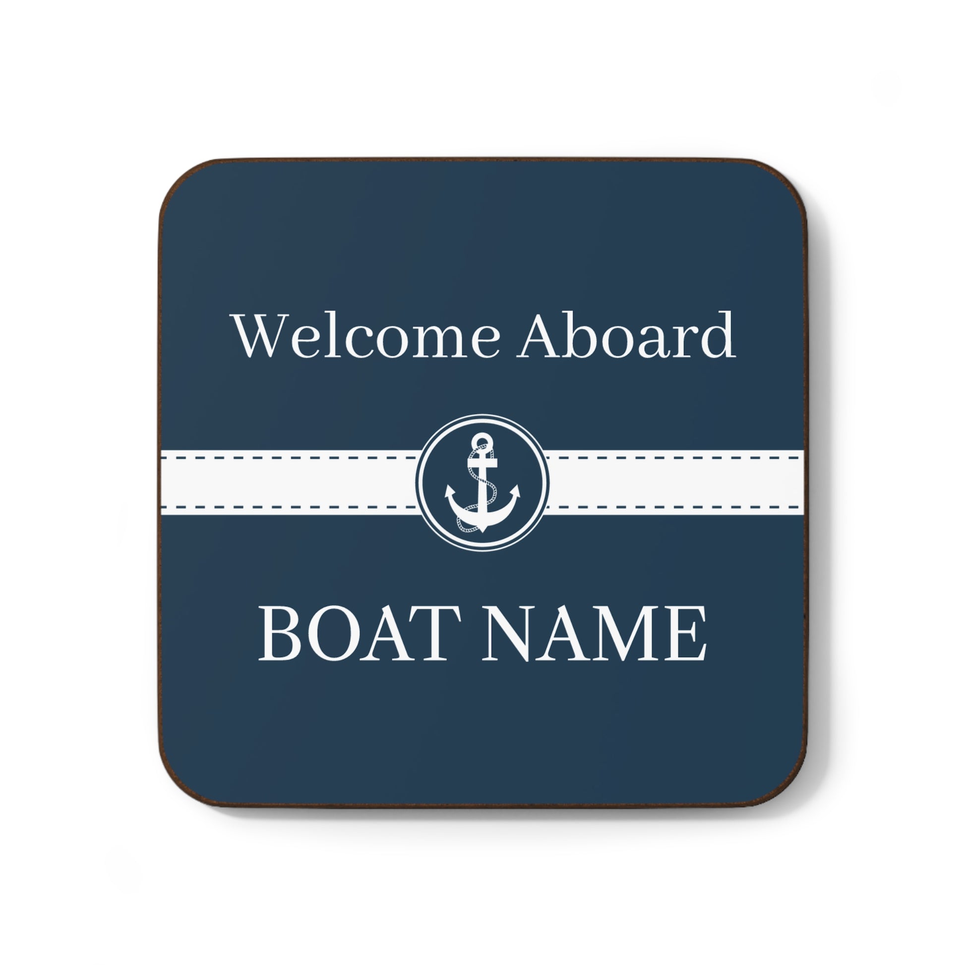 This is a set of 4 high quality nautical coasters personalized with your boat name. It features a blue and white anchor design.