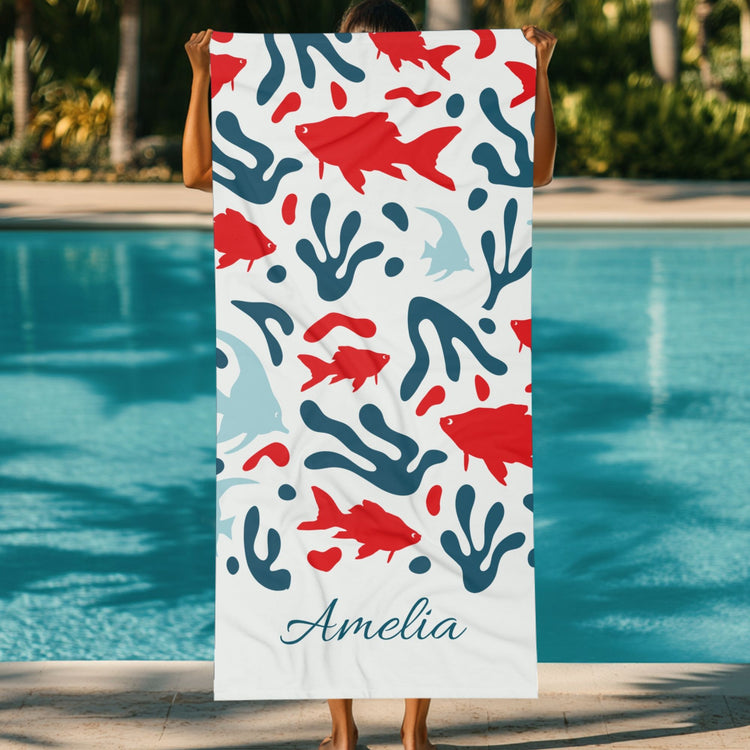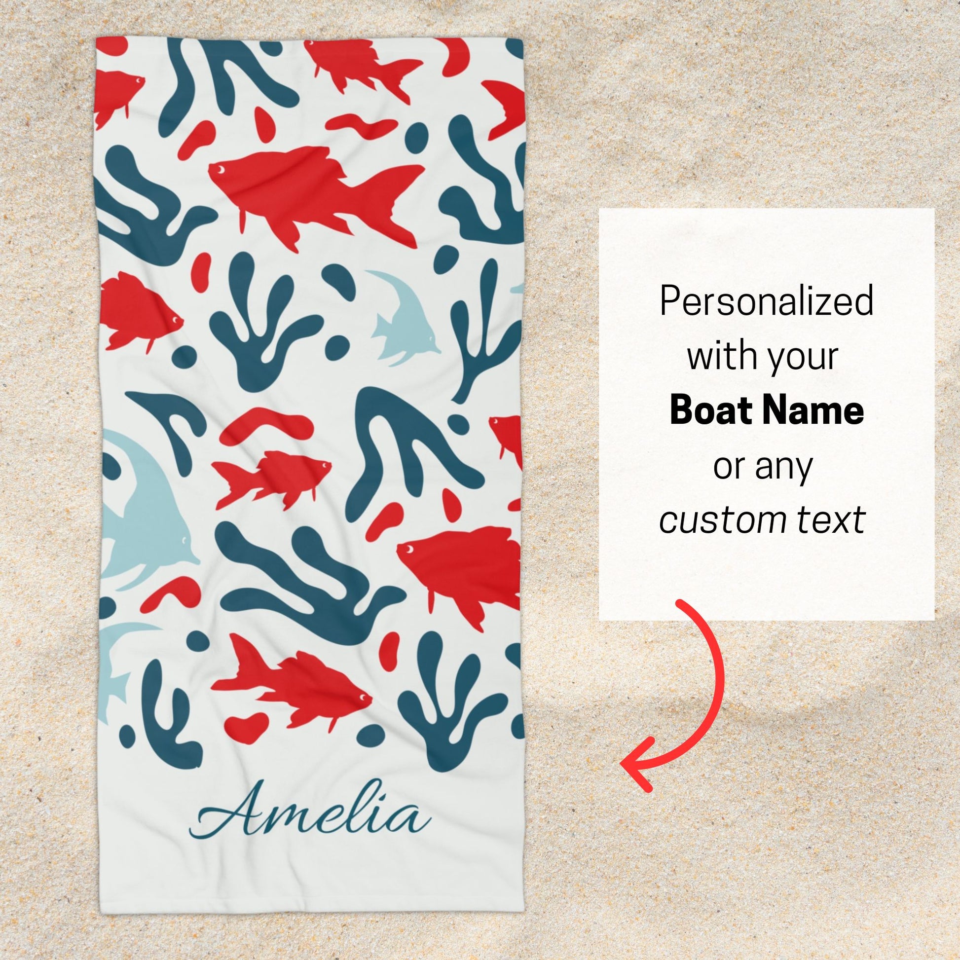 Bring vibrant ocean vibes to the beach with this personalized nautical towel featuring bright, colorful fish and your custom name printed across the front. Perfect for sunny beach days, poolside lounging, or tropical vacations!