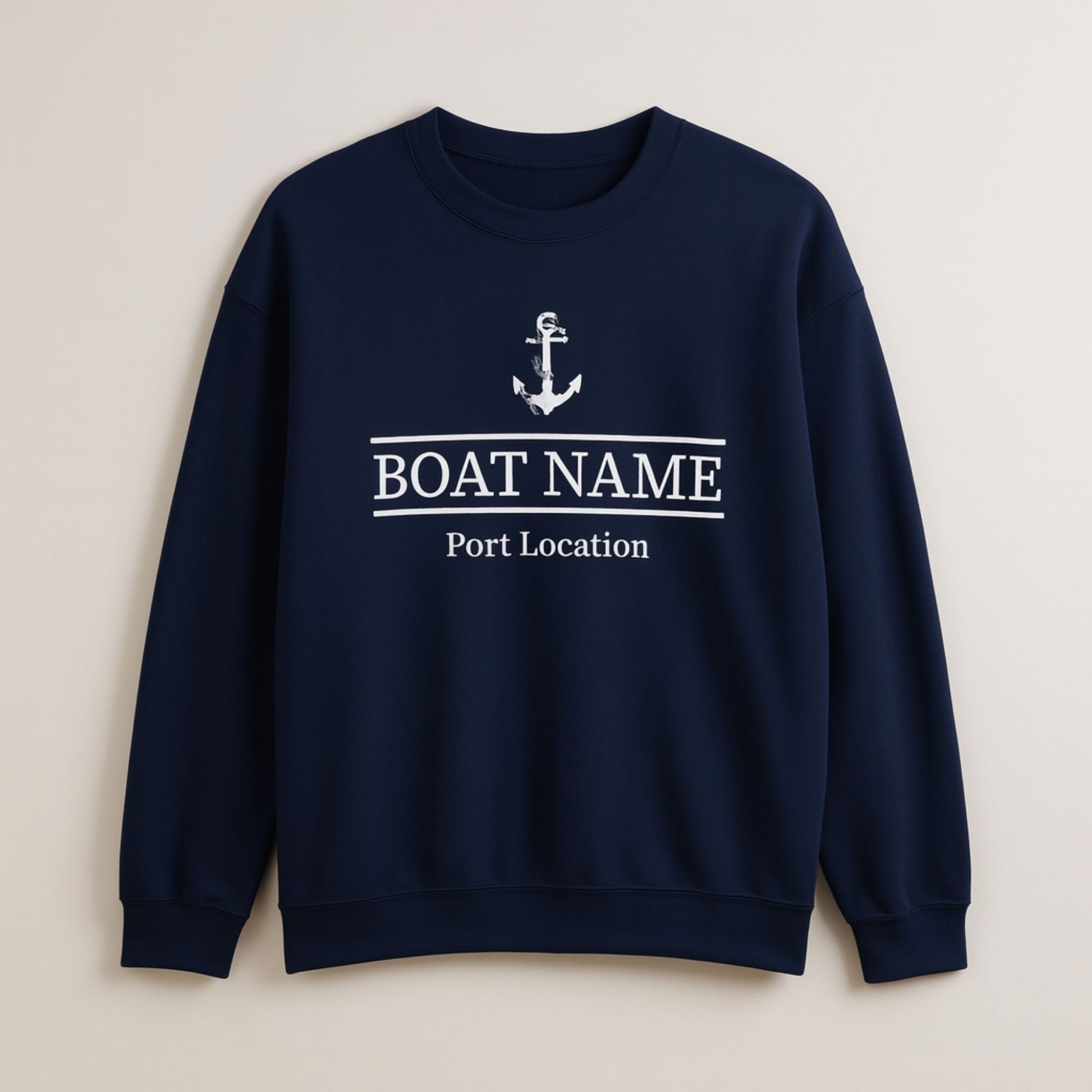 Custom boat name anchor sweatshirt with port location. Personalized nautical crewneck for sailors, captains, and yacht owners. Perfect sailing gift.