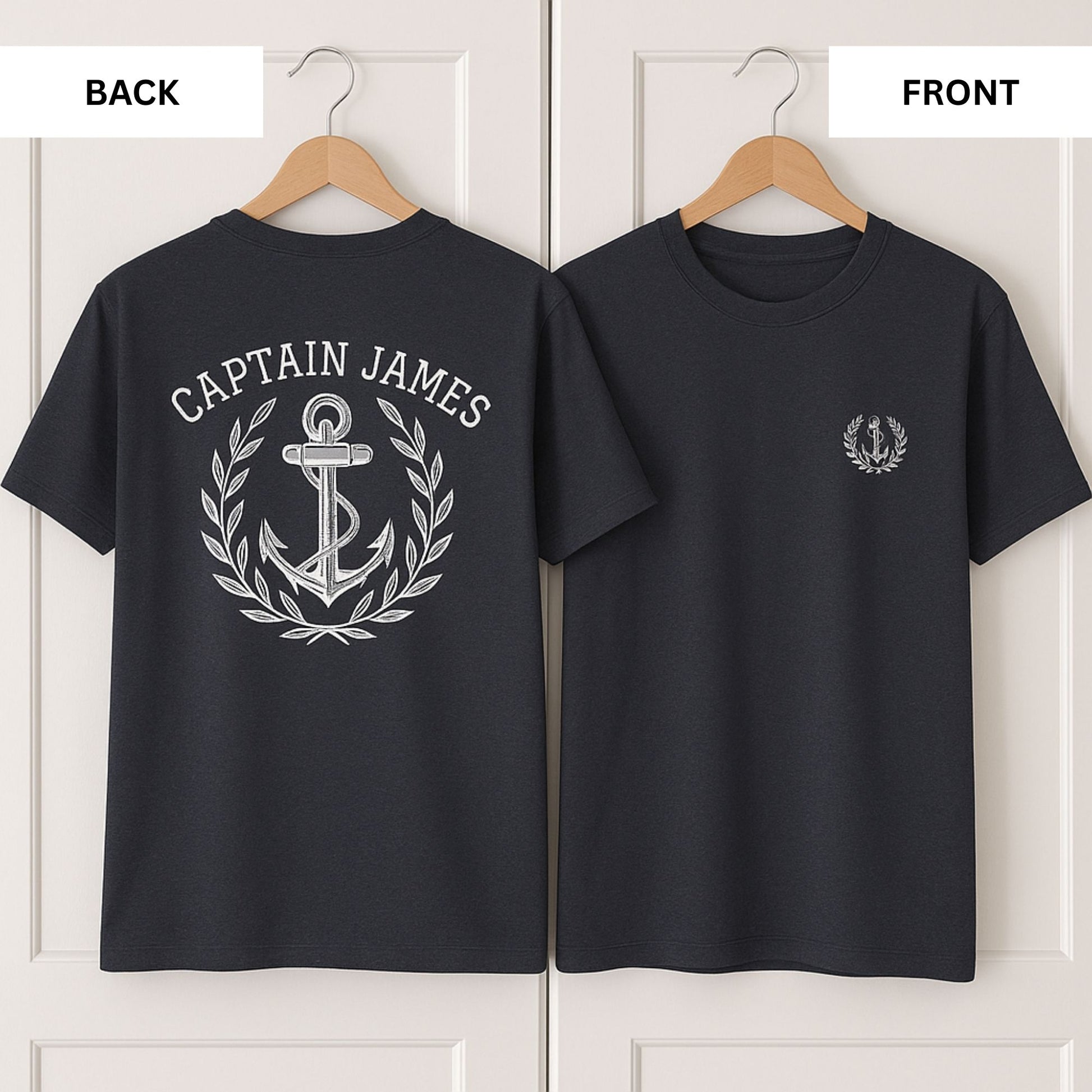 Personalize your style with this Custom Boat Name Anchor T-Shirt, designed for boat owners, captains, and sailing enthusiasts. Featuring a bold anchor and laurel design with customizable text, this nautical t-shirt is the perfect choice for days on the water, yacht club gatherings, or casual wear on shore.