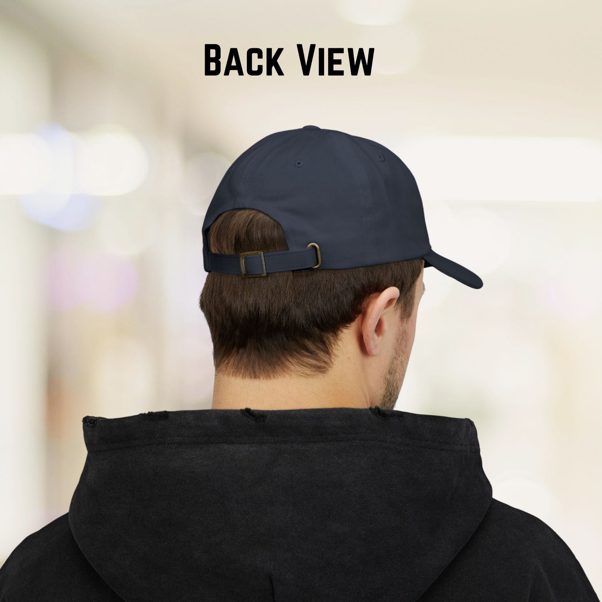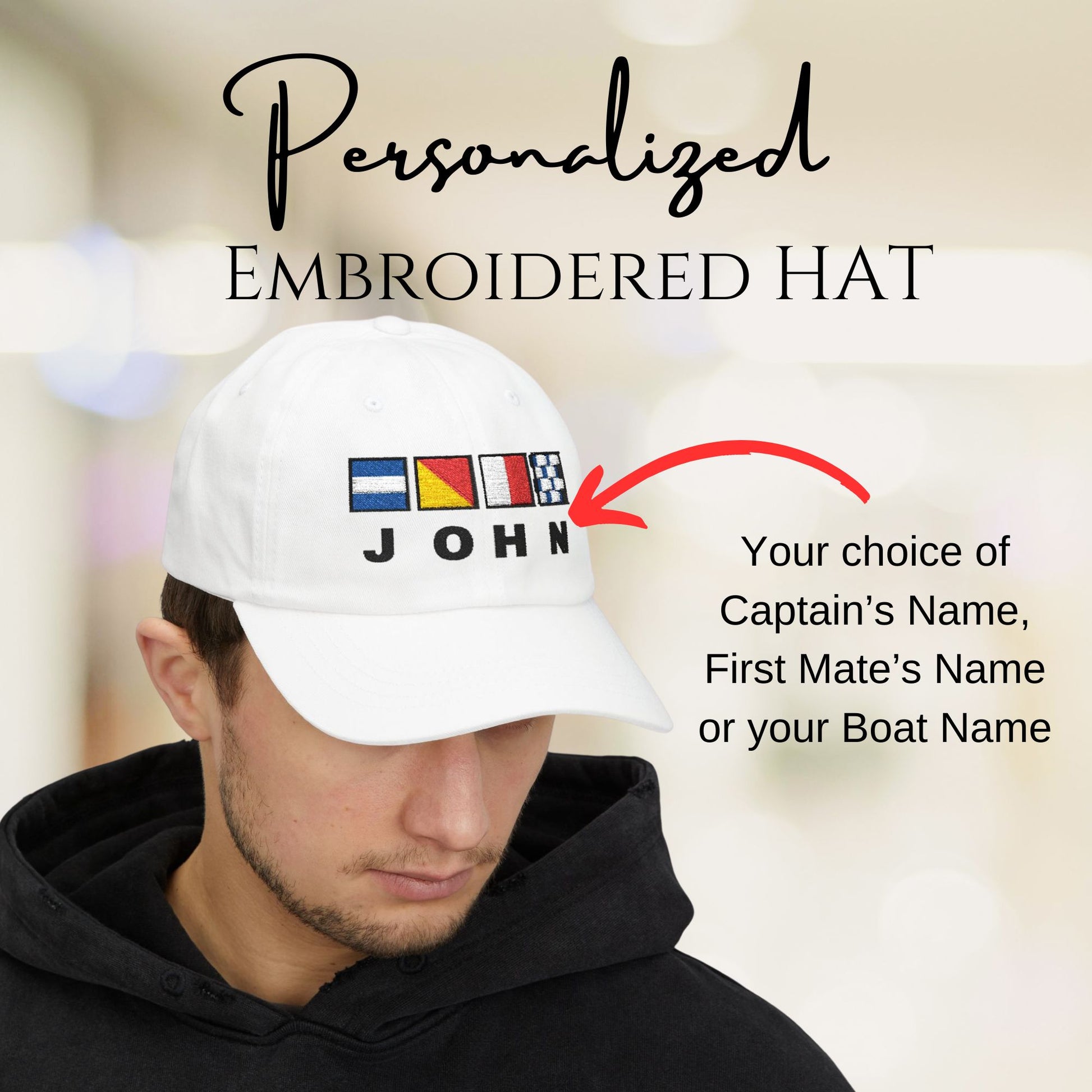 Personalized nautical dad hat with embroidered maritime flags and custom text. Classic cotton cap perfect for sailors, captains, and boating gifts. Available in 8 colors.