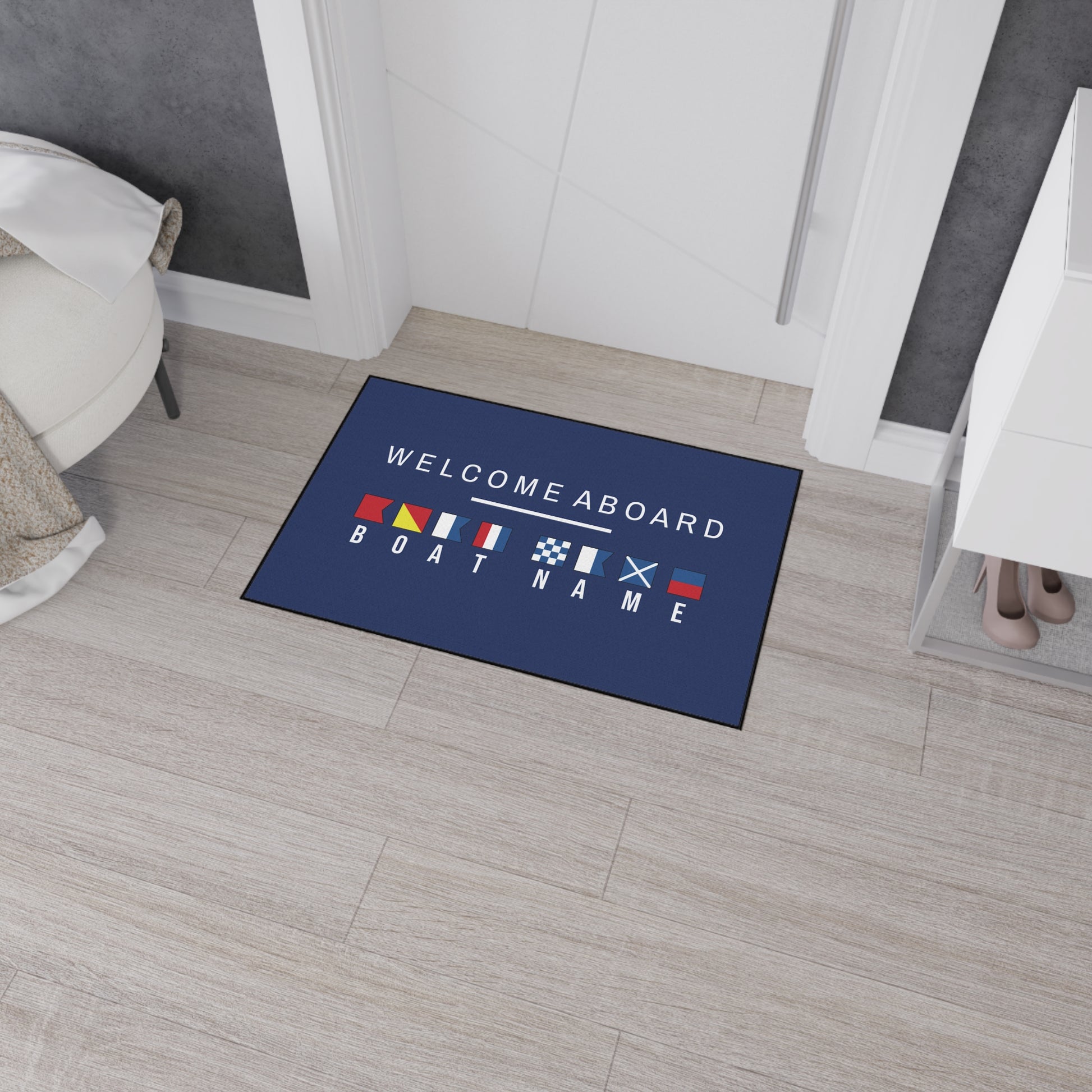 This heavy duty floor mat features a personalized nautical design for your boat or home.