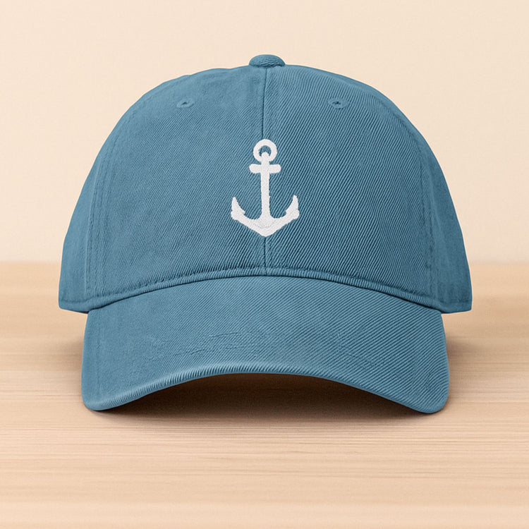 Classic nautical anchor embroidered denim hat. 100% cotton, low-profile, adjustable fit — perfect for sailors, boaters, and sea lovers.