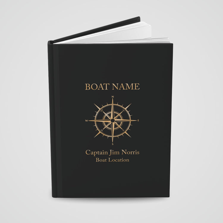 This is a personalized hard cover journal. The design features your boat name, Captain name and location with a gold compass over a black or blue background.