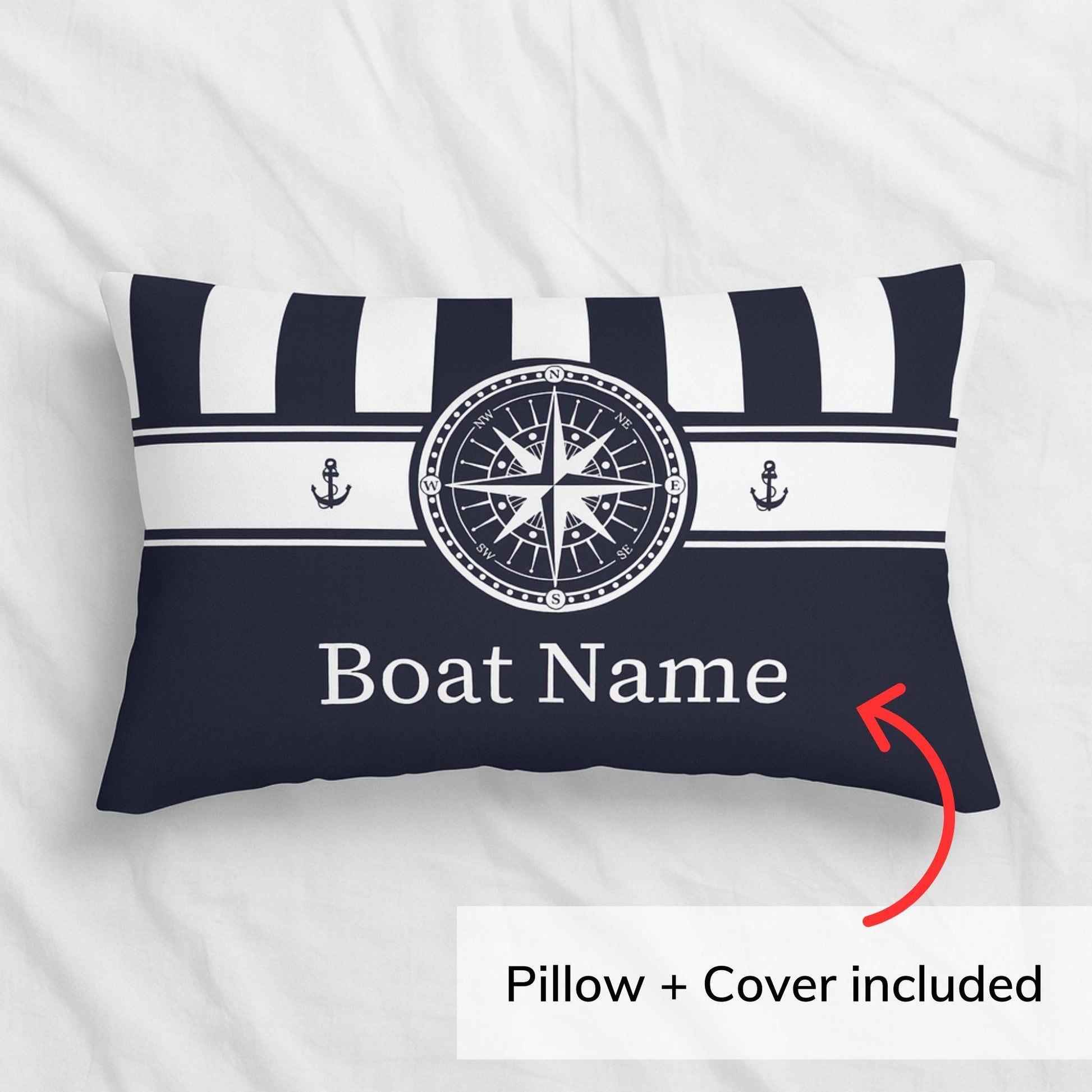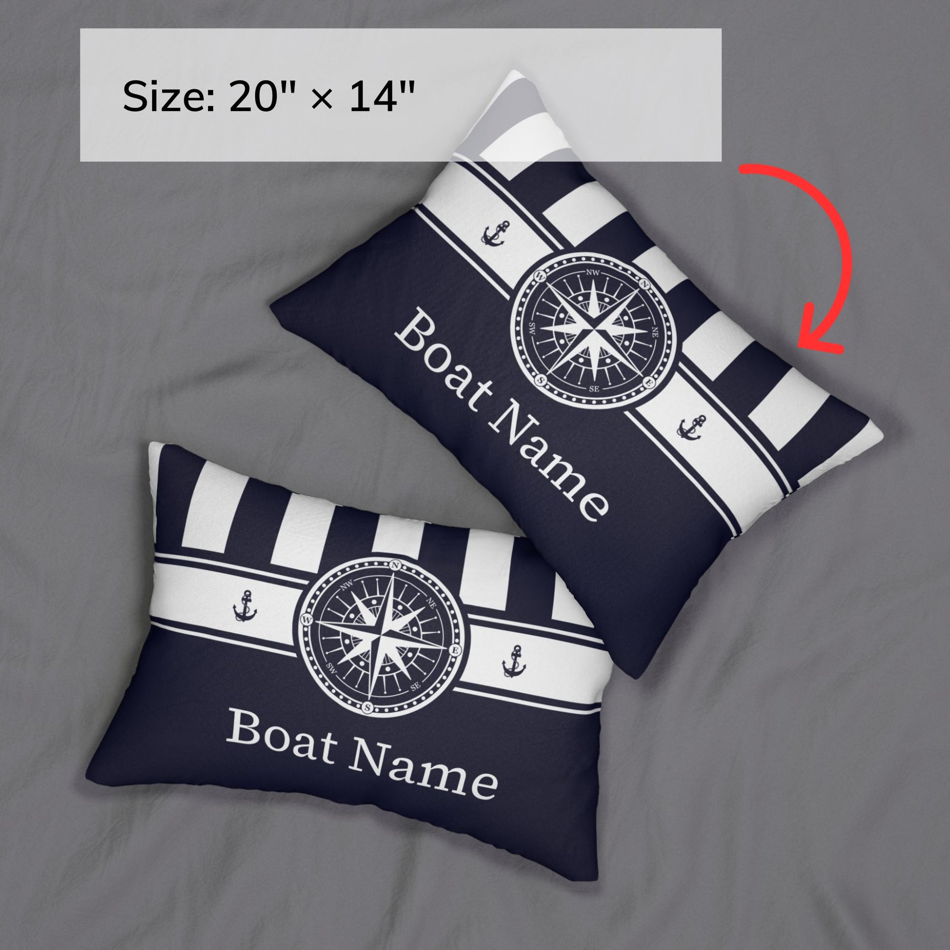 Bring a clean nautical vibe to your space with this customizable compass lumbar pillow. Designed with blue and navy stripes and a crisp compass graphic, it’s the perfect personalized pillow for boat lovers, coastal homes, beach houses, and nautical decor. Add your boat name for a custom piece that’s uniquely yours.