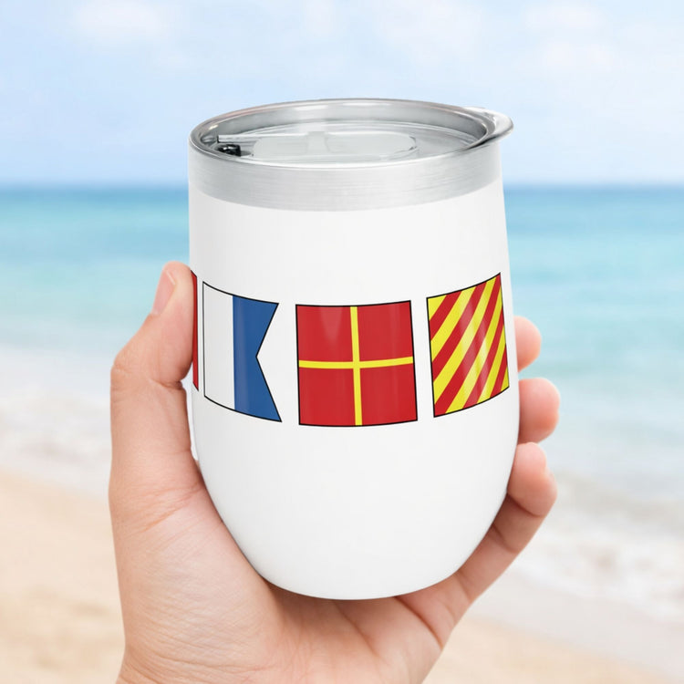 Personalized nautical flags wine tumbler with maritime signal design. Custom boating tumbler gift for boat owners, captains, sailing lovers, beach or lake days.