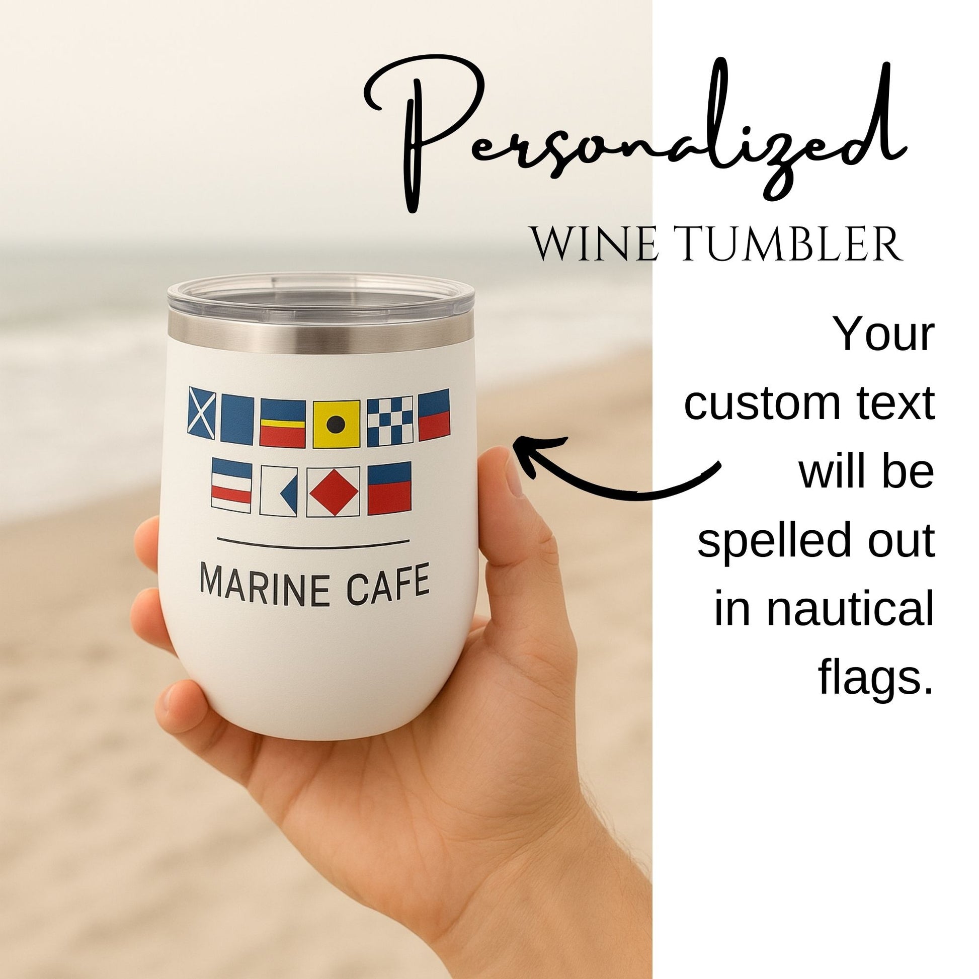 Personalized nautical flags wine tumbler, 12oz stainless steel insulated. Custom sailing gift for sailors, boat owners, or beach lovers.
