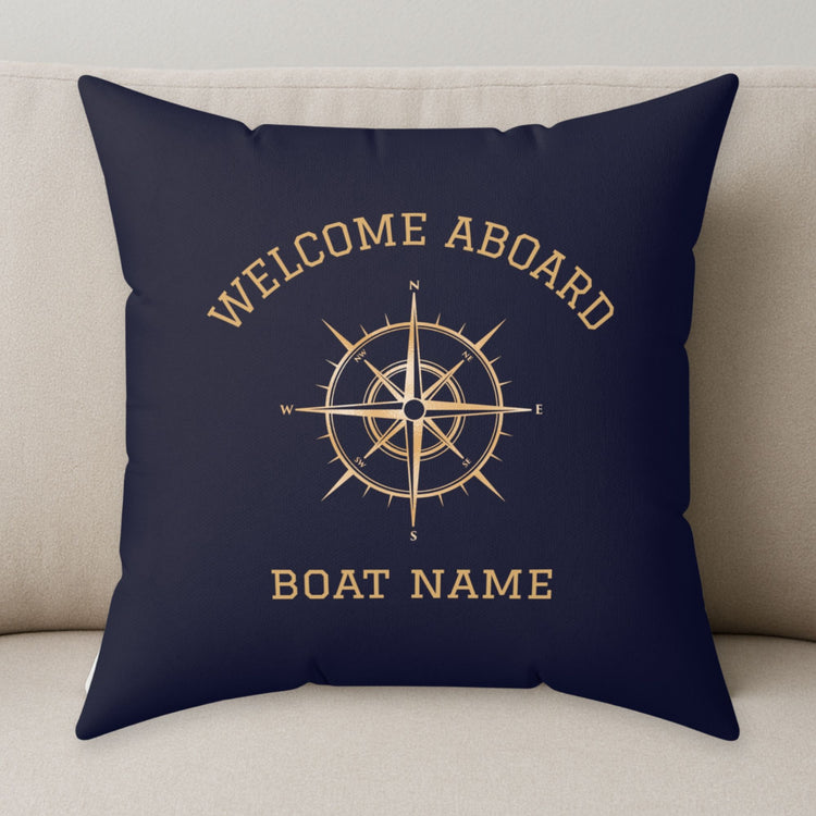 Add classic maritime style to your space with the Navy Gold Compass Pillow — a luxurious personalized pillow designed for boat owners, yacht lovers, and anyone drawn to the sea. Featuring a golden compass design with “Welcome Aboard” and your custom boat name, this boat pillow makes an unforgettable boating gift or elegant accent for any nautical home décor.