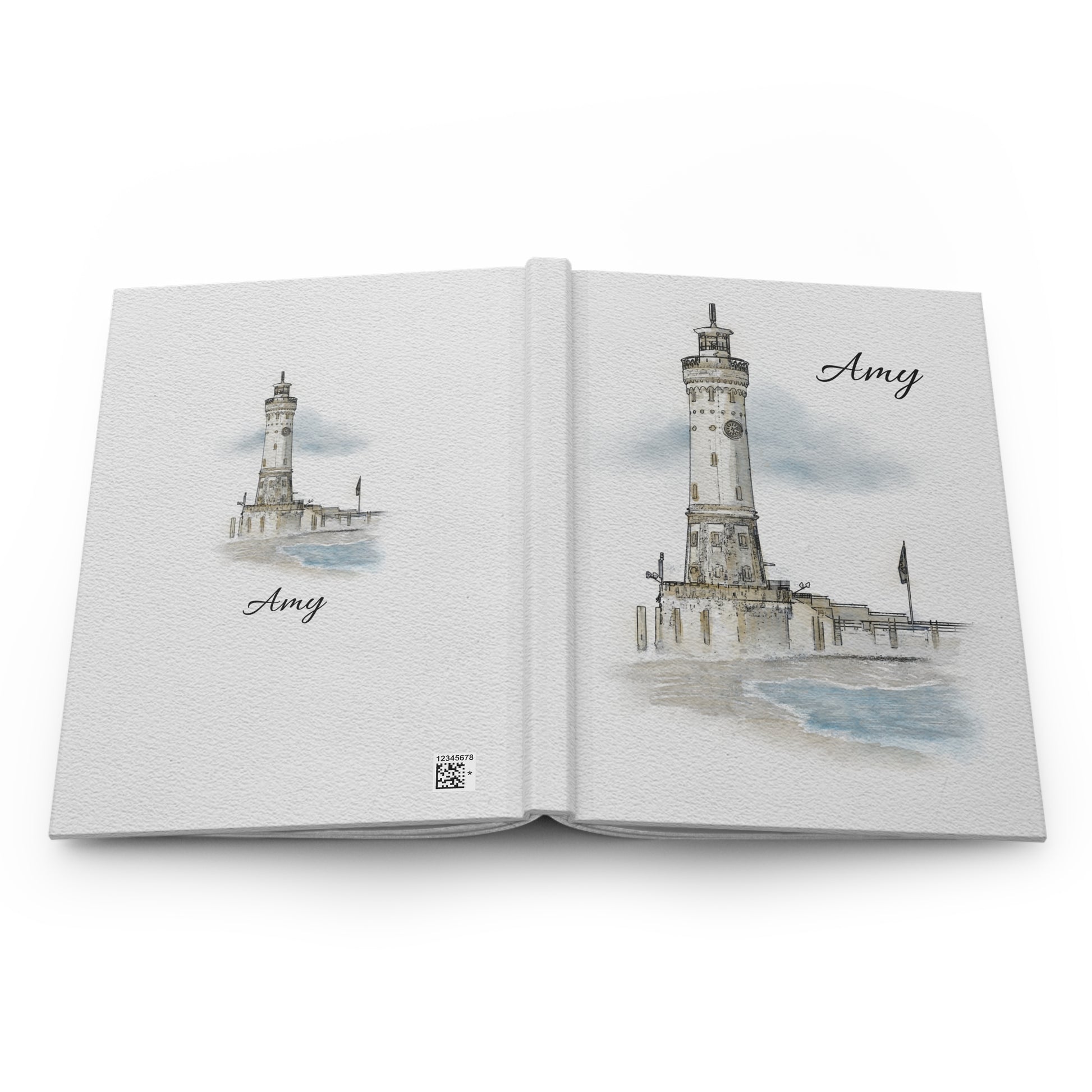 This is a personalized hard cover journal. The design features a watercolor lighthouse with your custom name or text. Just type in the text that you would like printed when you order. This is perfect for travel journal, sailing journal, boating journal, personalized gift.