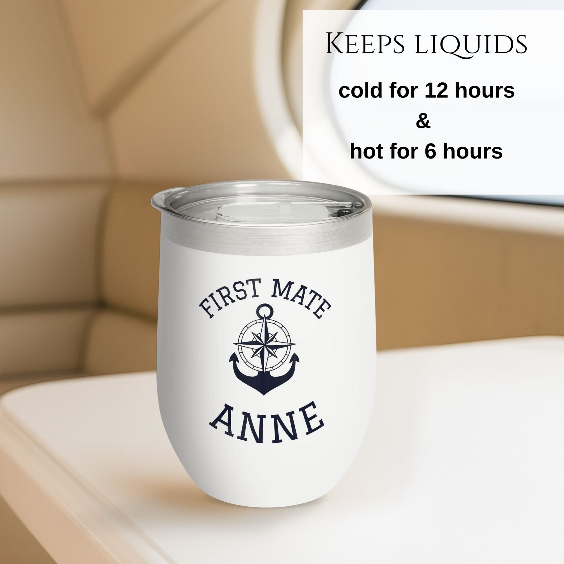 Personalized anchor and compass wine tumbler, 12oz stainless steel insulated. Custom nautical gift for sailors, boat owners, or beach lovers.