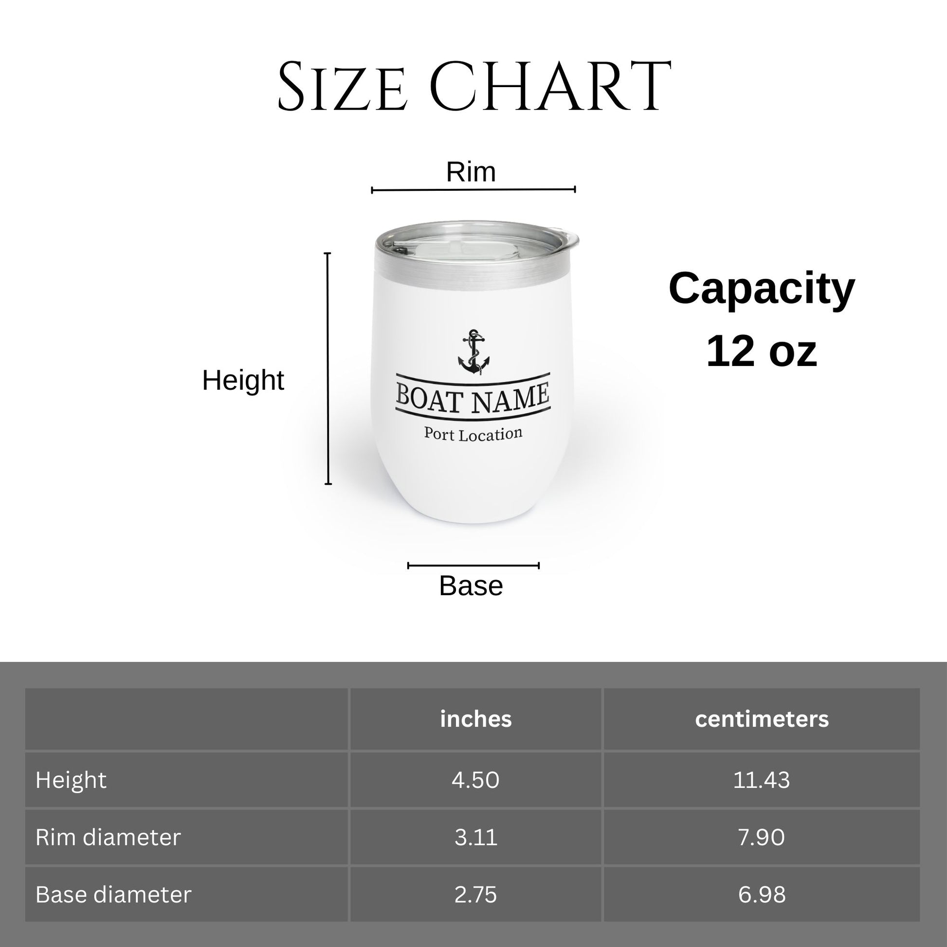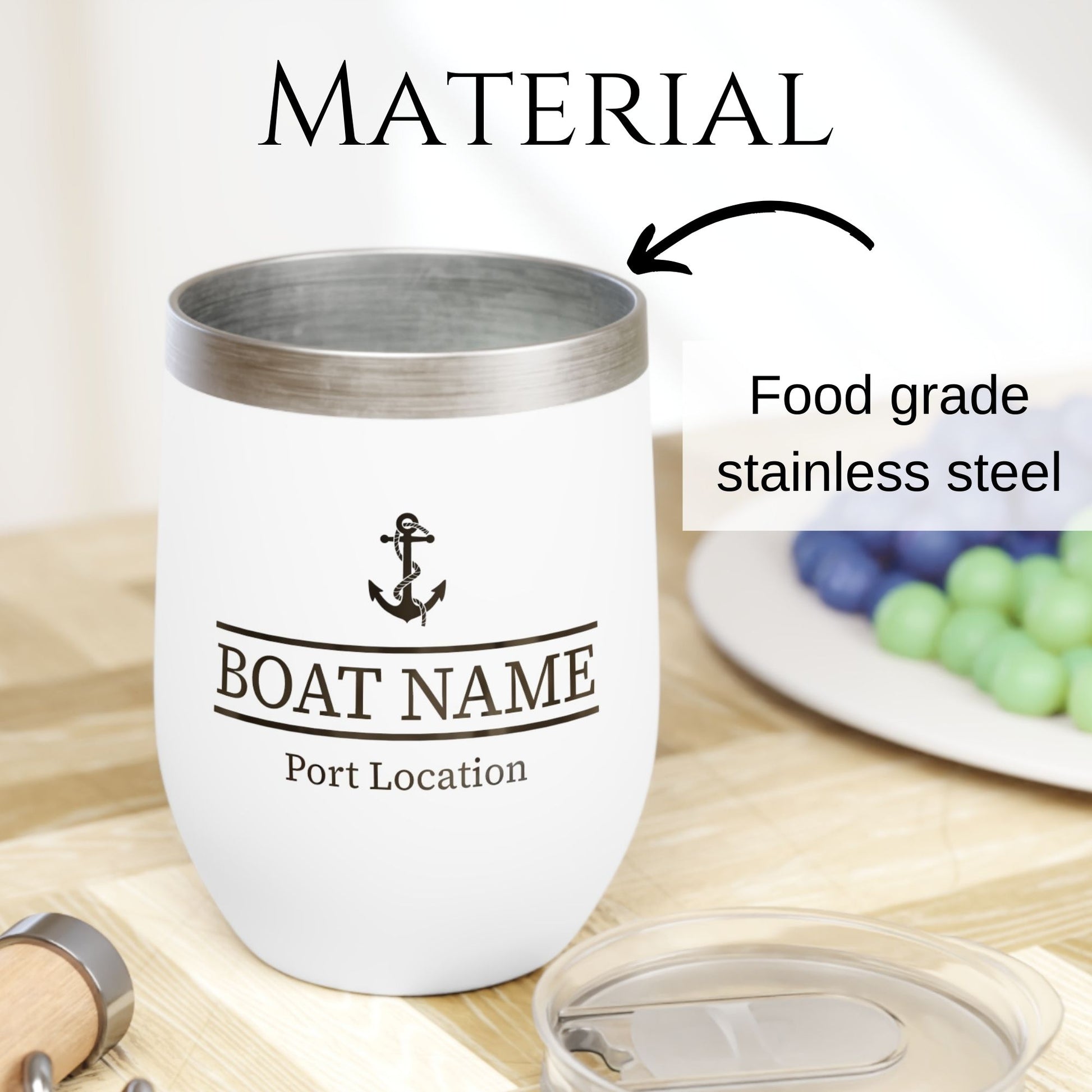 Custom anchor wine tumbler with boat name. 12oz insulated stainless steel keeps drinks hot or cold. Personalized nautical gift for sailors, captains, and beach lovers.