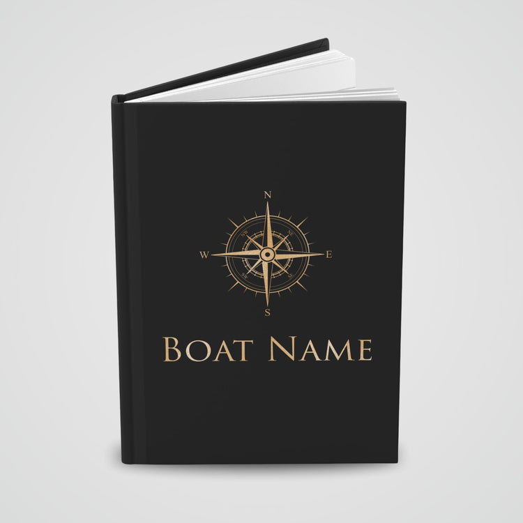 This is a personalized hard cover journal. The design features your boat name or custom text with a gold compass over a black or blue background. Just type in the text that you would like printed when you order.