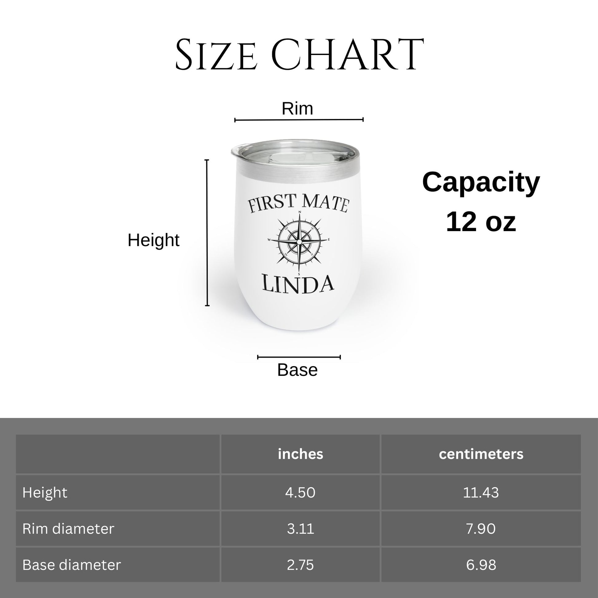 Enjoy your favorite drinks with this personalized compass wine tumbler. The 12oz size is perfect for wine, coffee, tea, or cocktails. Double-wall vacuum insulation keeps drinks hot up to 6 hours and cold up to 12 hours.