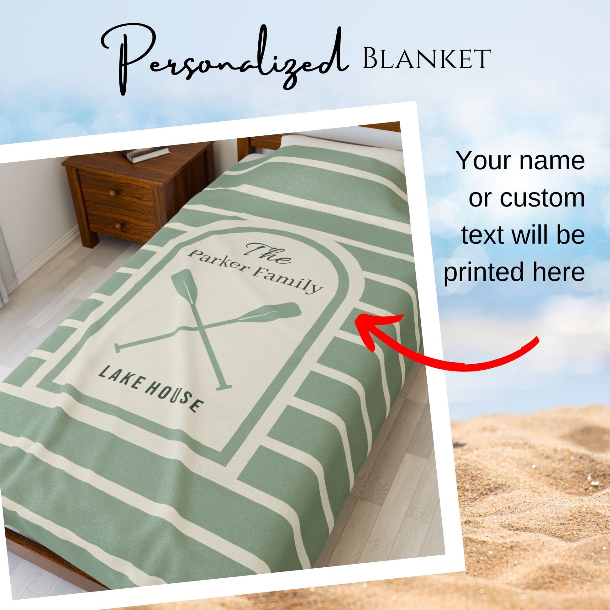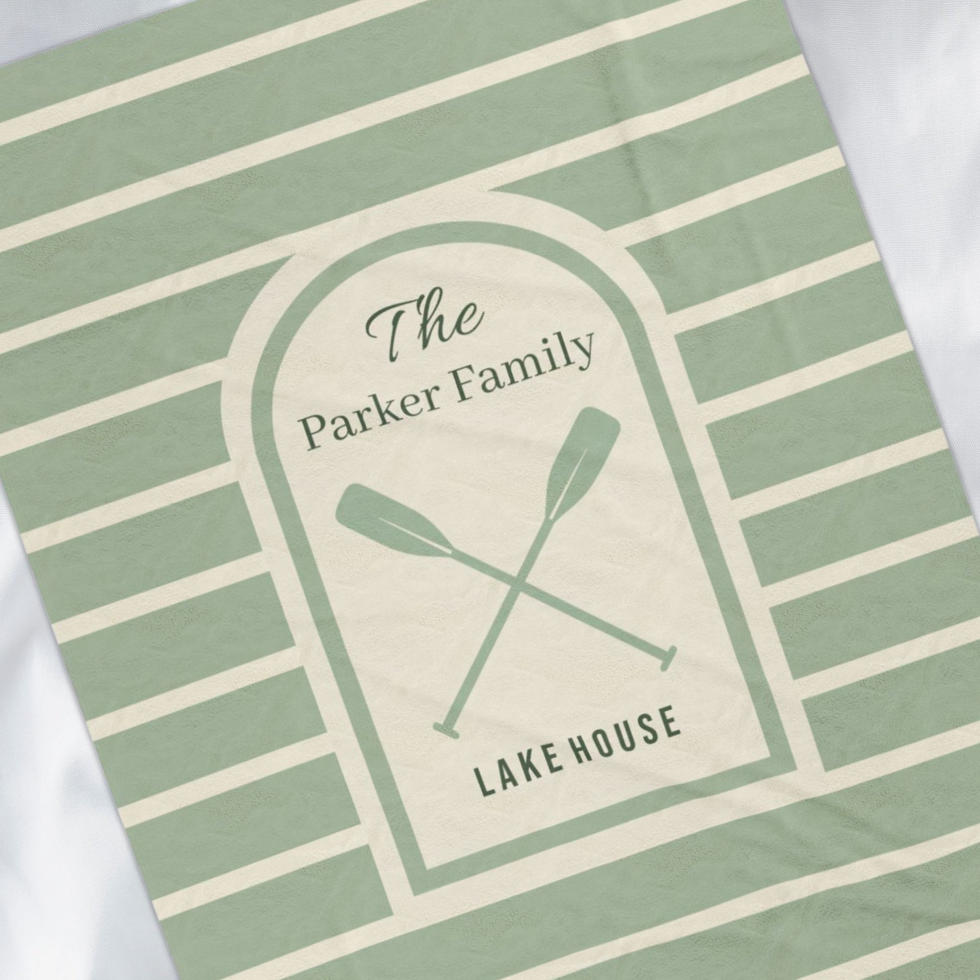 Personalized lake house blanket with family name and oar design. Soft velveteen plush blanket for cabins, beach houses, and coastal homes.