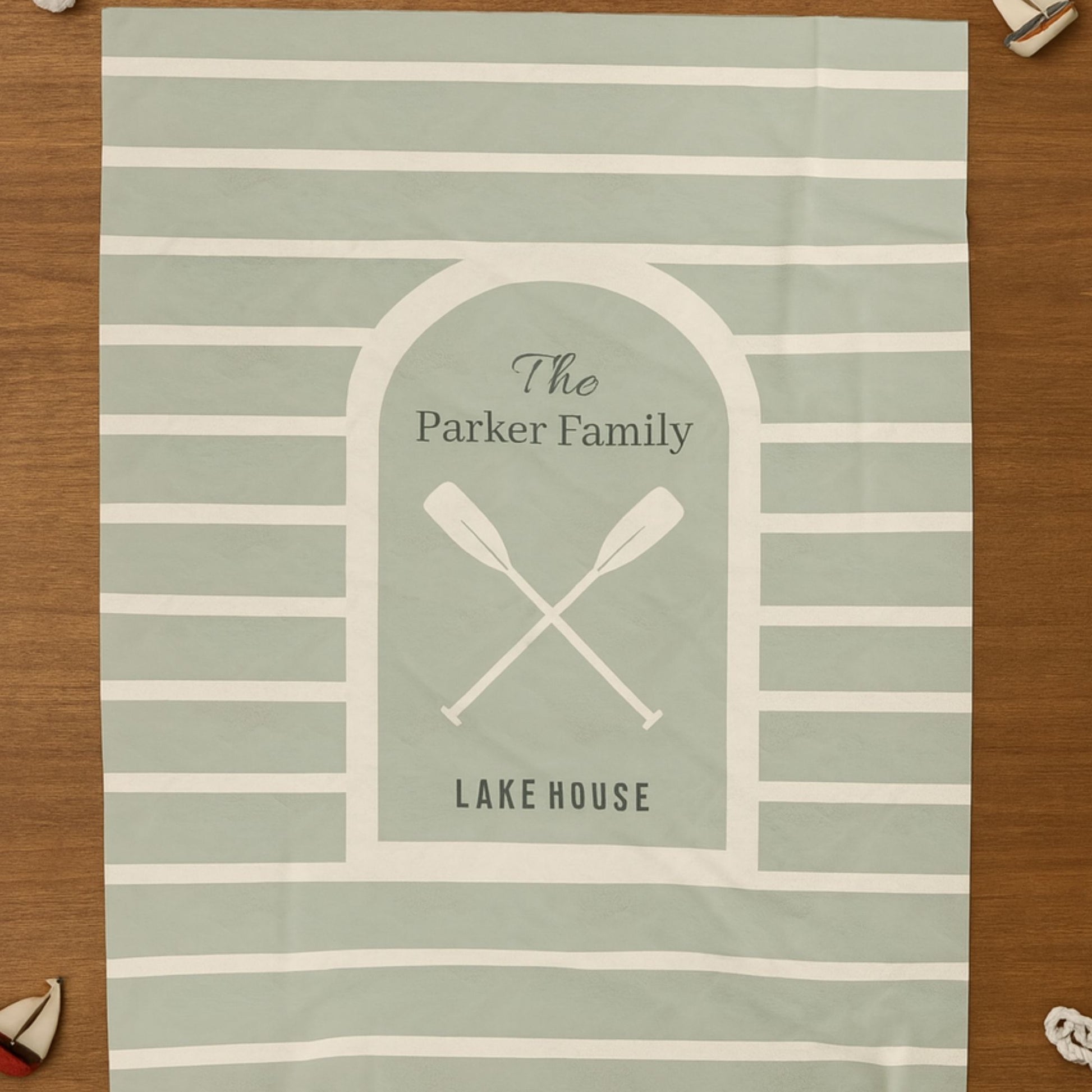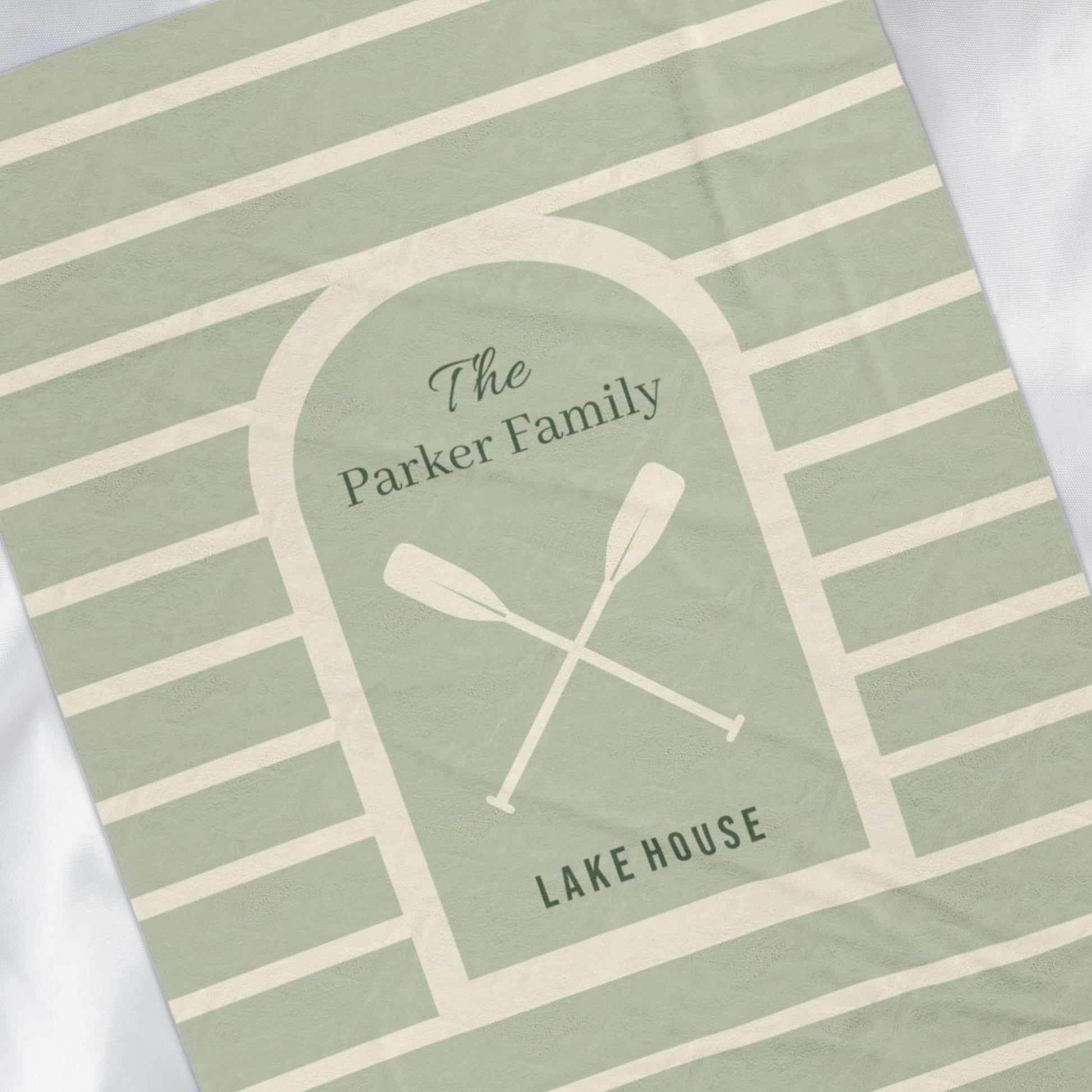 Personalized lake house blanket with family name. Soft velveteen plush throw with oar design. Perfect for cabins, cottages, or coastal homes.