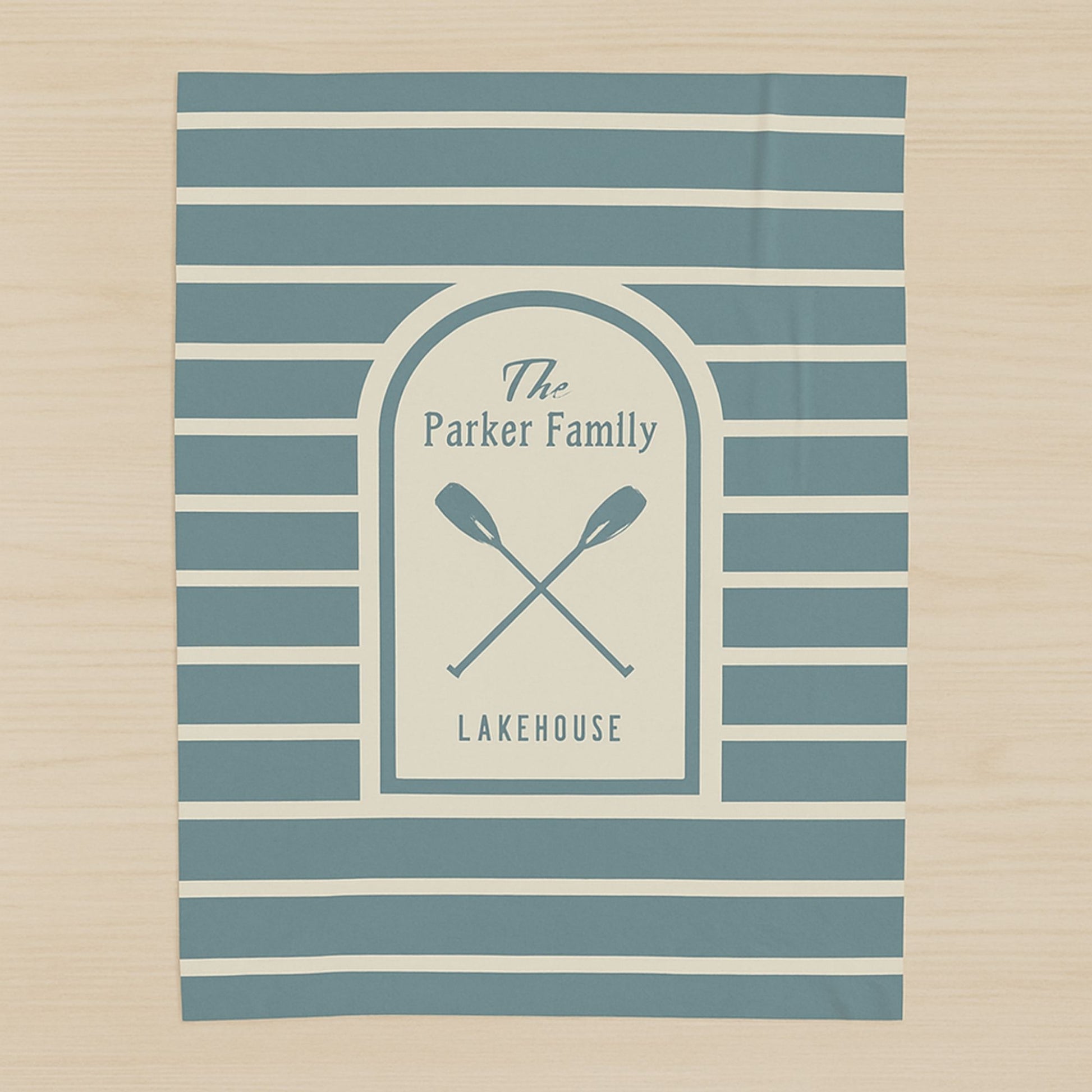 Personalized lake house blanket with family name and oar design. Soft velveteen plush throw for cabins, cottages, and coastal home décor.