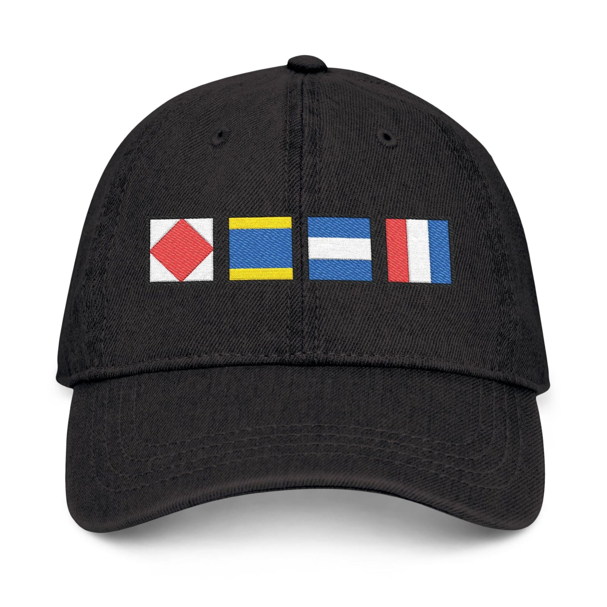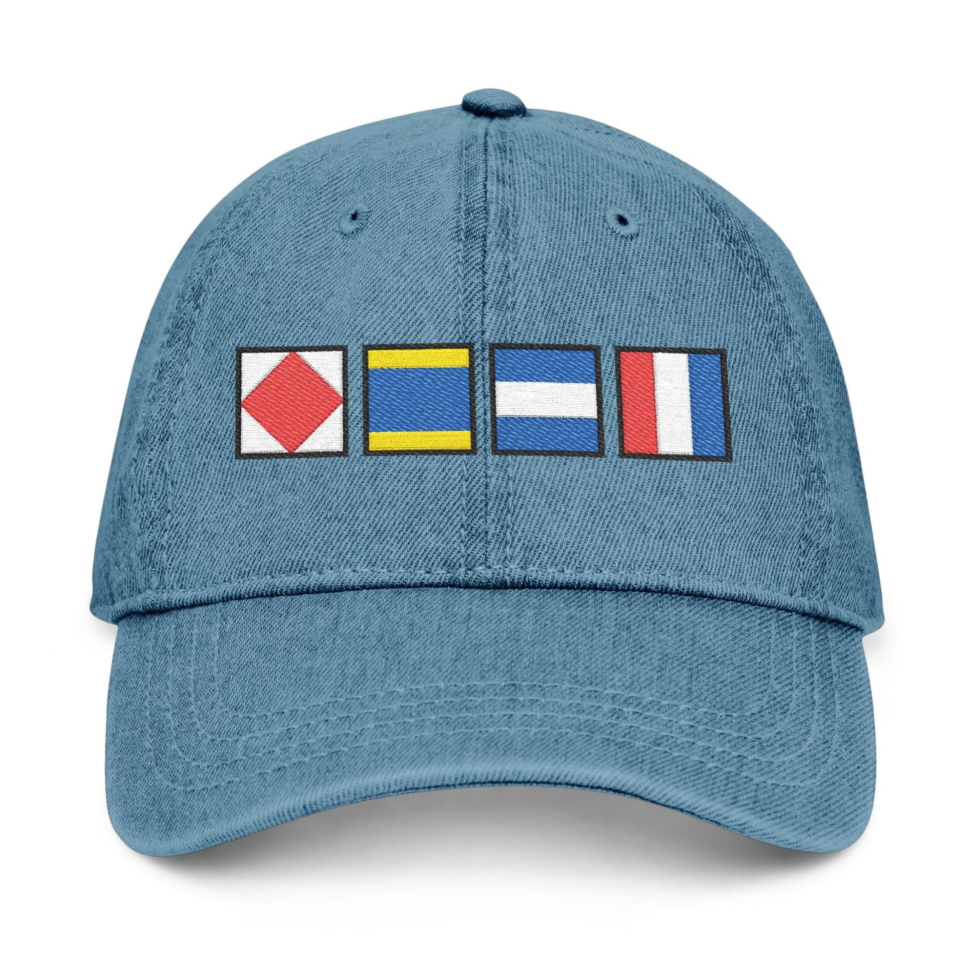 Personalized nautical flags denim hat embroidered with custom maritime signals. Stylish, 100% cotton, adjustable, and perfect for sailors and boat lovers.