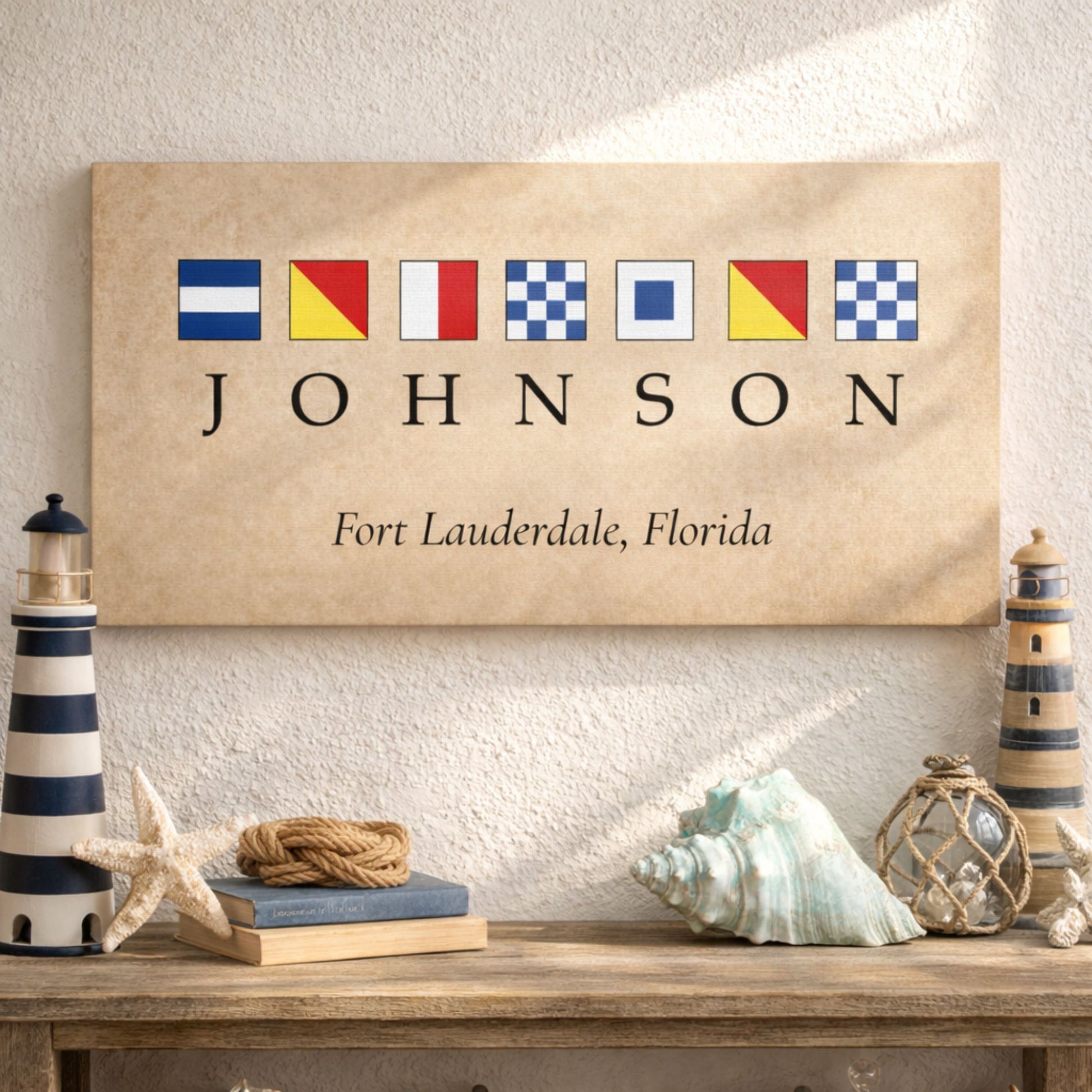 Create custom nautical wall art featuring classic maritime signal flags. This personalized canvas is designed to showcase a family name and location, but can be customized with any text or family motto. A timeless addition to coastal home decor, beach houses, lake houses, and nautical-themed interiors.