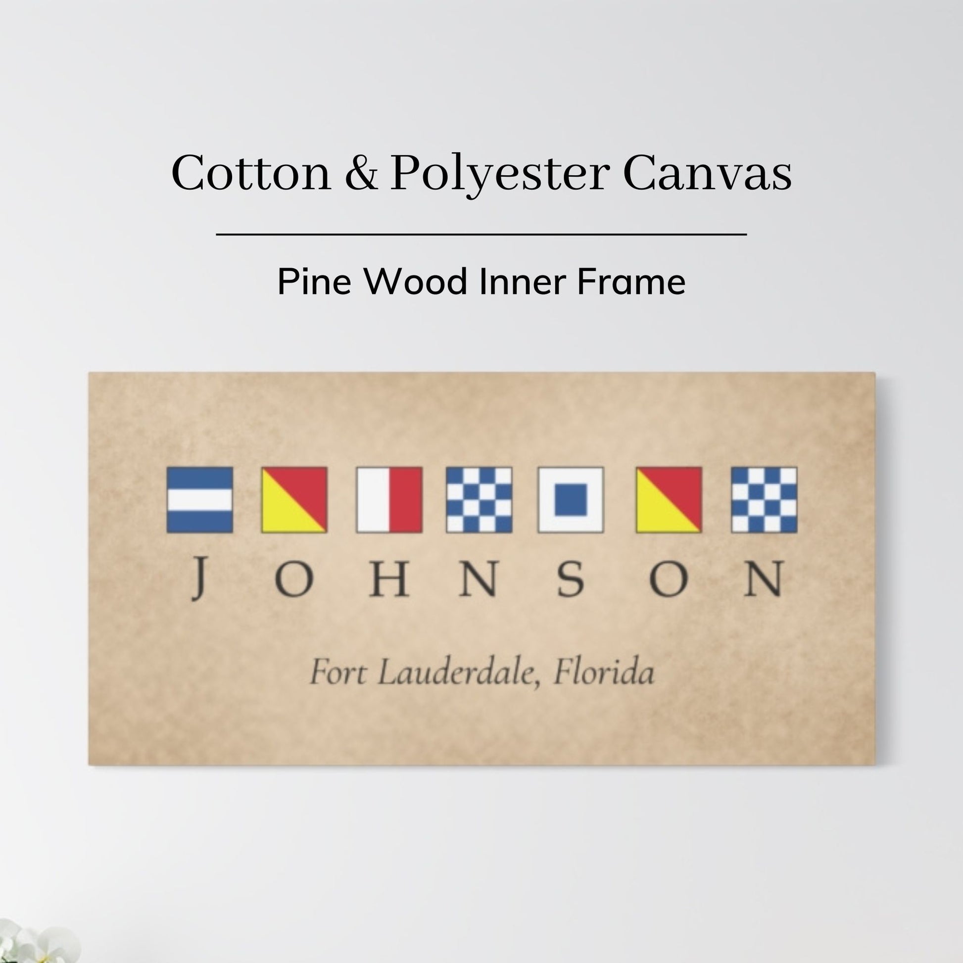 Personalized nautical signal flag canvas featuring your family name. Maritime wall art for sailors, captains, and boat lovers. Perfect nautical home décor gift.