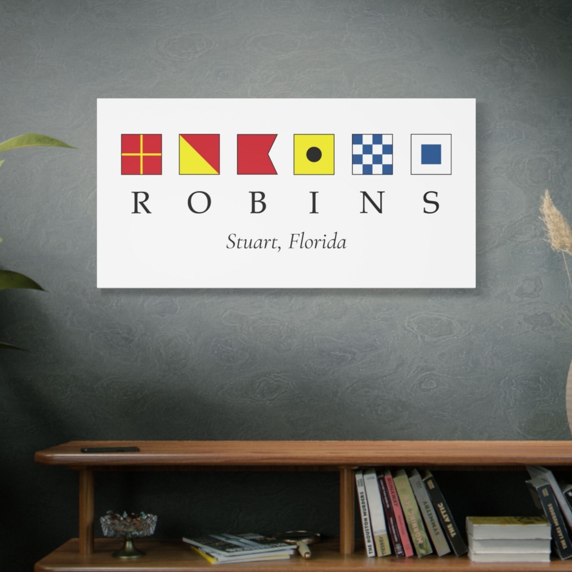 This personalized canvas wall art displays custom text using traditional maritime signal flags. Ideal for coastal homes, beach houses, or nautical-themed spaces.