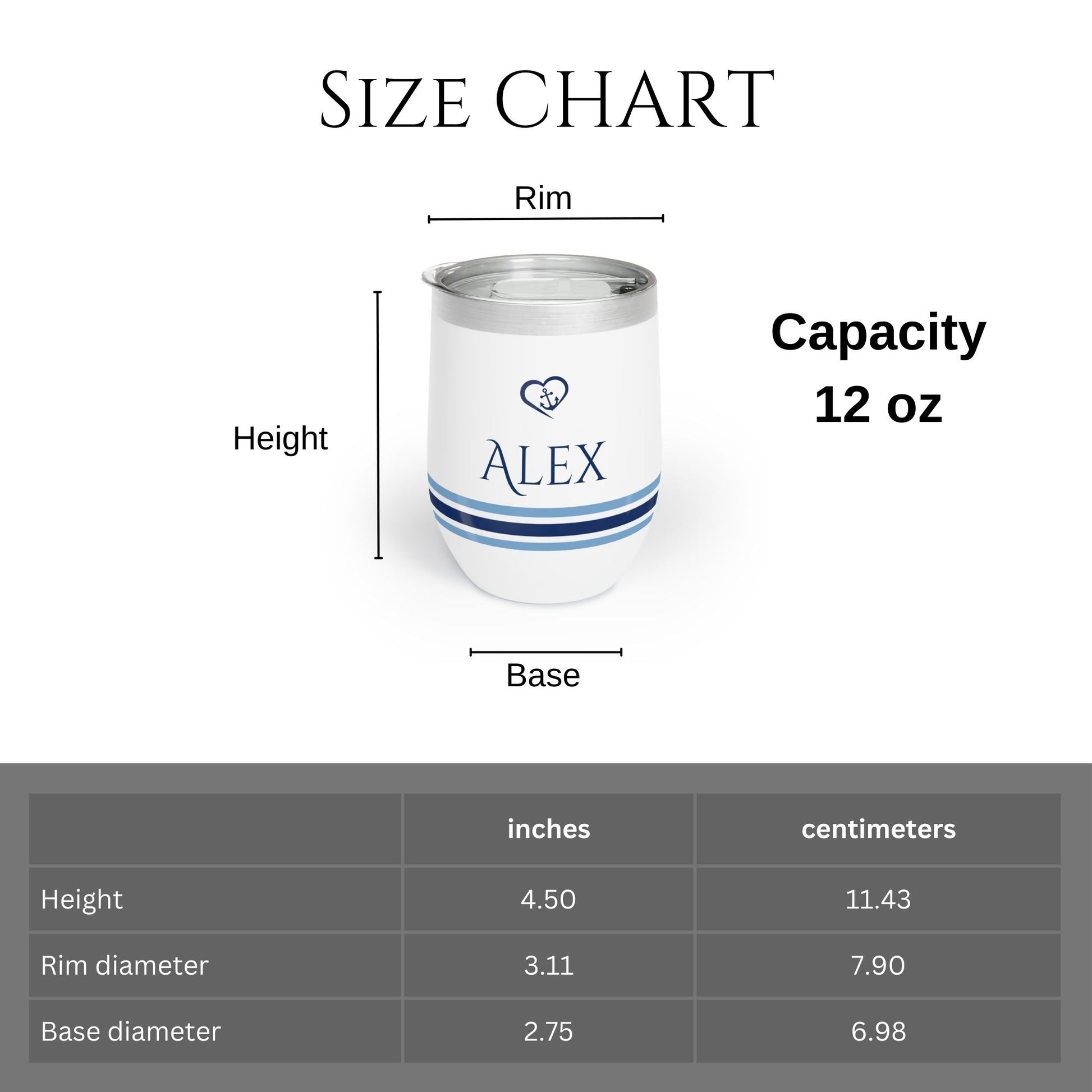 Set sail in style with this personalized nautical wine tumbler featuring a classic blue stripe background with an anchor and heart design. This 12oz stainless steel insulated tumbler is perfect for wine, cocktails, coffee, or tea. Thanks to its double-wall vacuum insulation, drinks stay hot for up to 6 hours or cold for up to 12 hours.