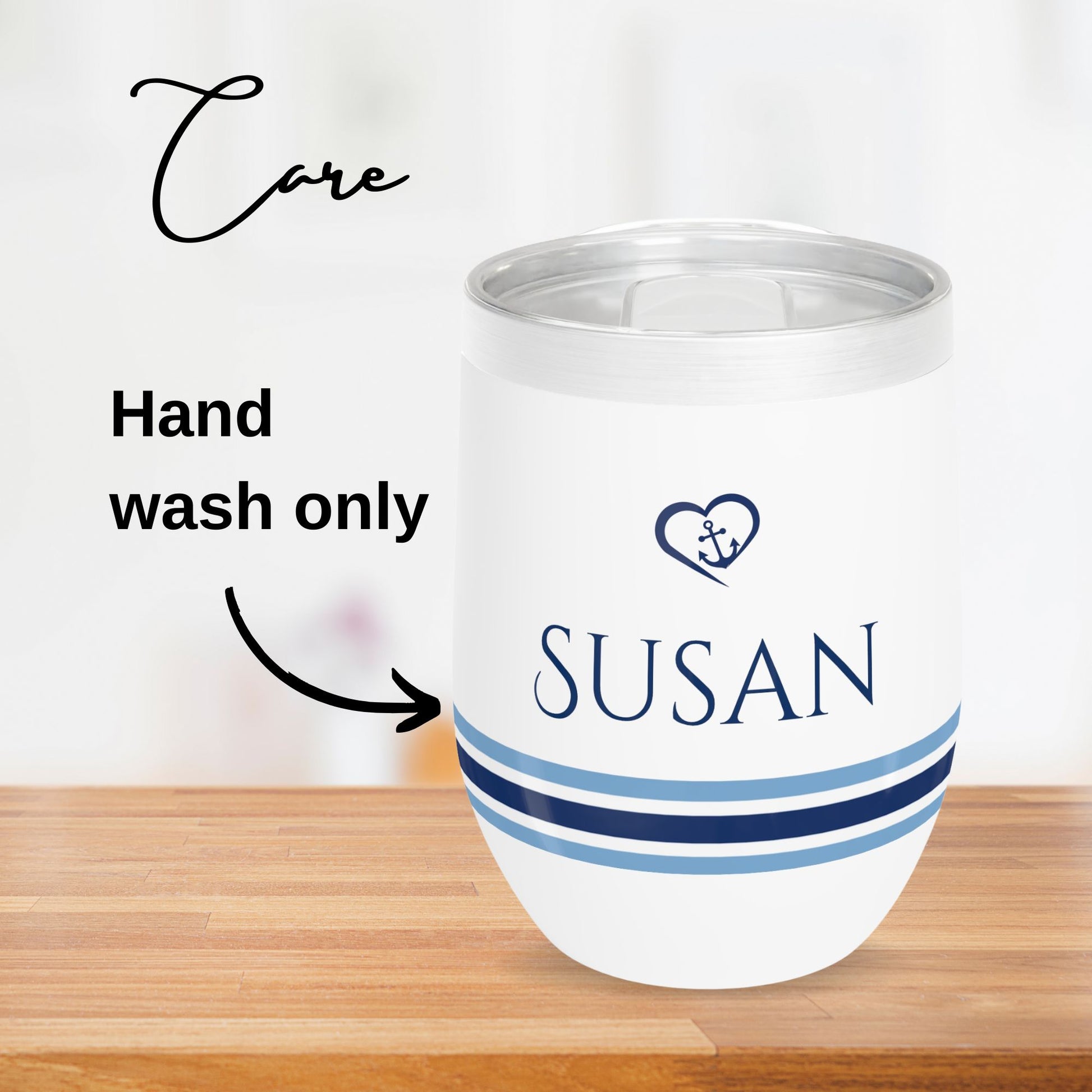 This custom nautical wine tumbler makes the perfect boat gift, sailor gift, beach house accessory, or personalized coastal drinkware. Stylish, practical, and built for the sea.