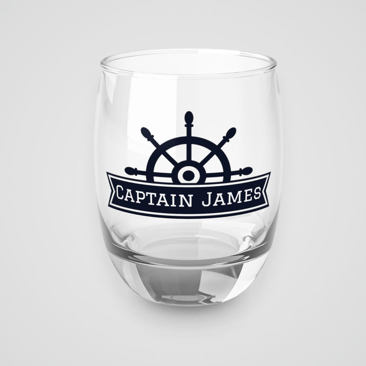 This is a personalized whiskey glass with a ship wheel design. Your name or custom text will be on the glass.