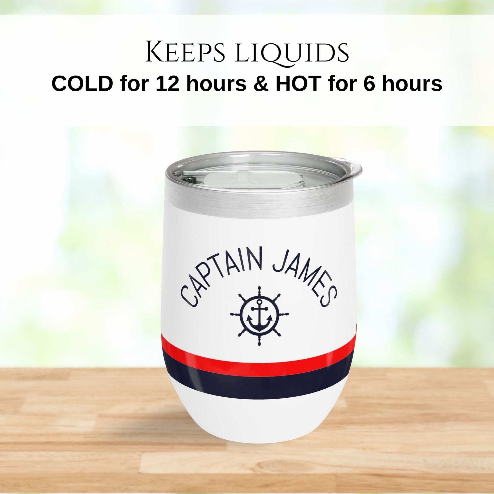 Sail in style with this personalized ship wheel wine tumbler featuring a nautical anchor and ship wheel design over bold red and blue stripes. Crafted from 12oz stainless steel with double-wall vacuum insulation, it keeps drinks hot for up to 6 hours and cold for up to 12 hours — perfect for wine, cocktails, coffee, or tea.