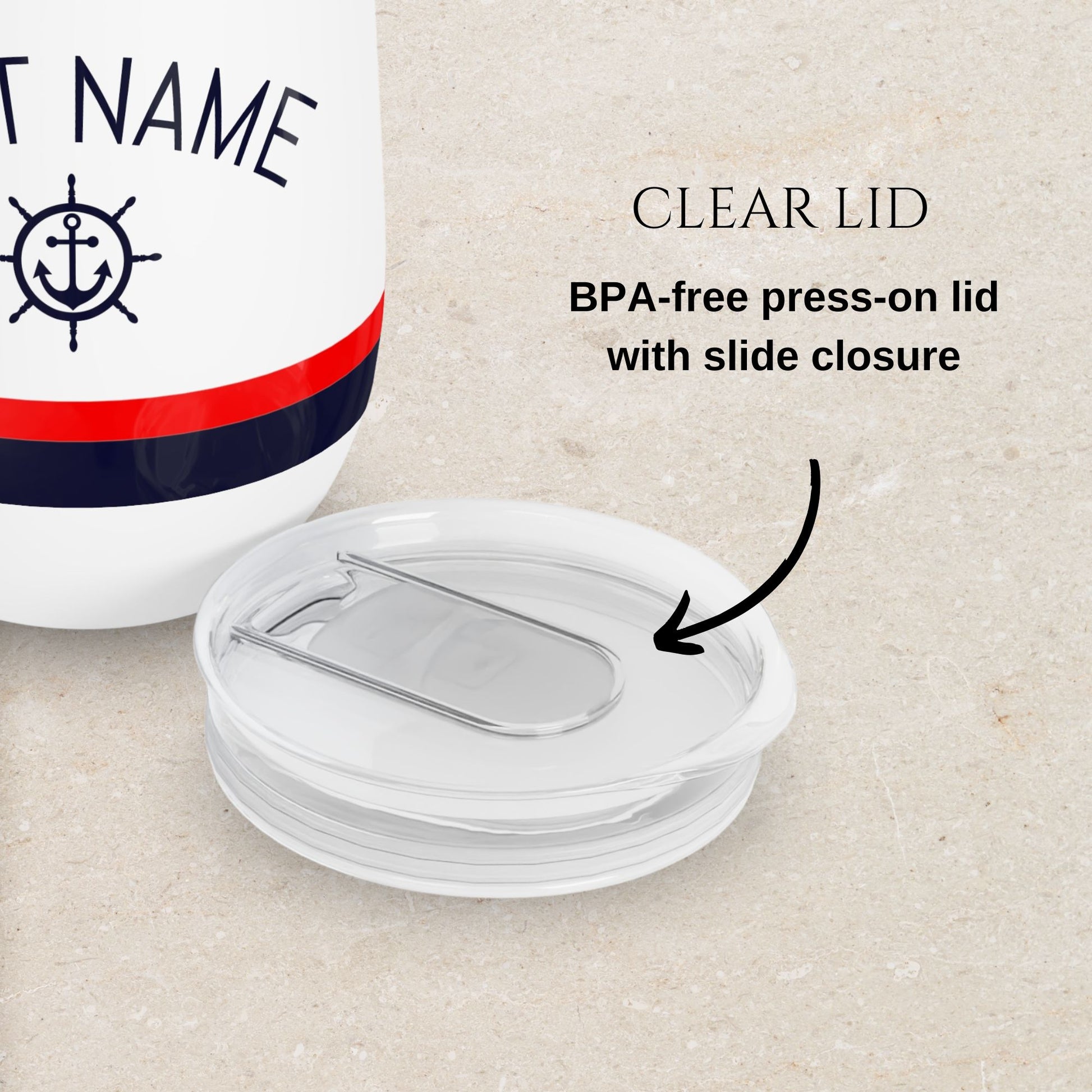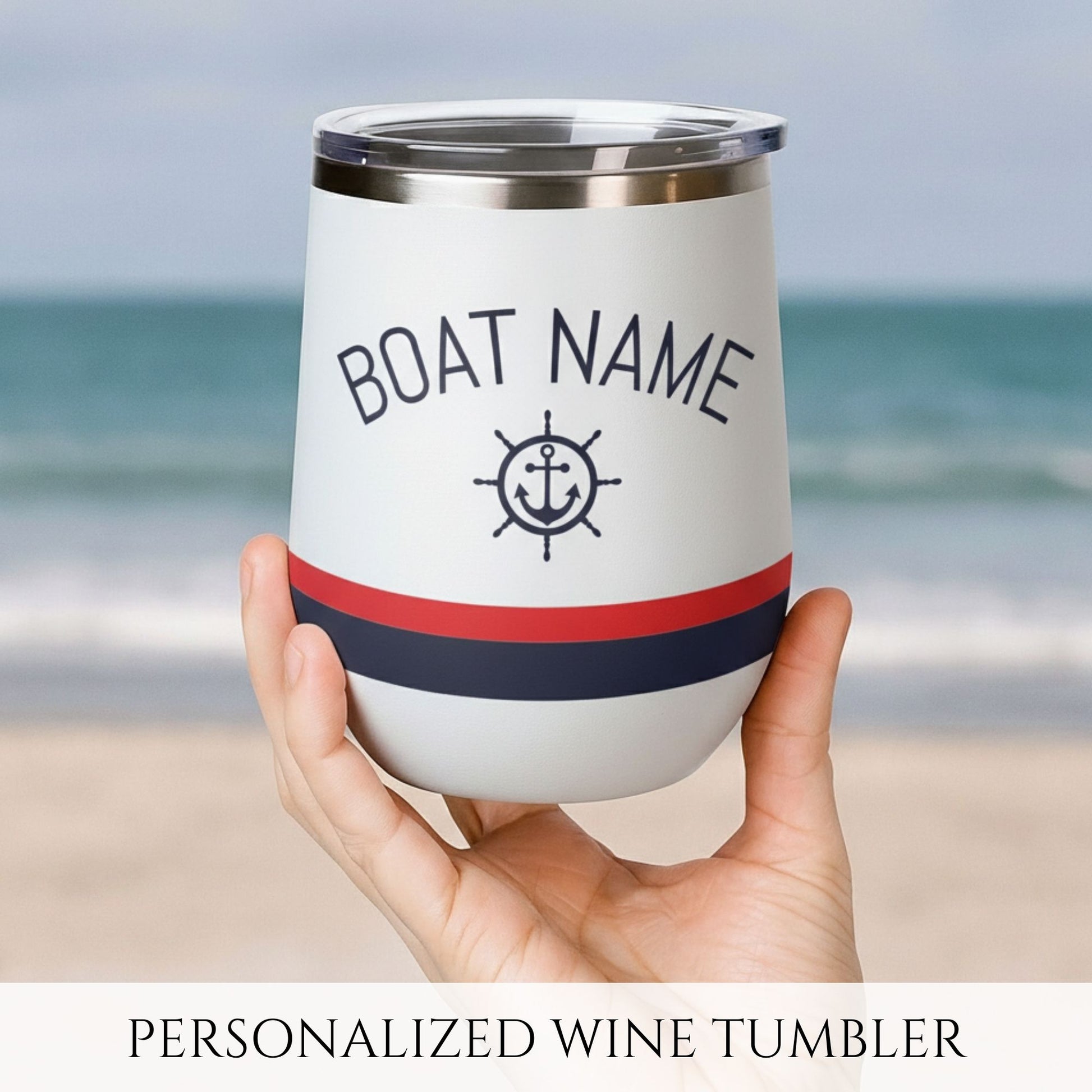 This custom nautical wine tumbler is a stylish and practical sailing gift, boat gift, or coastal home accessory.